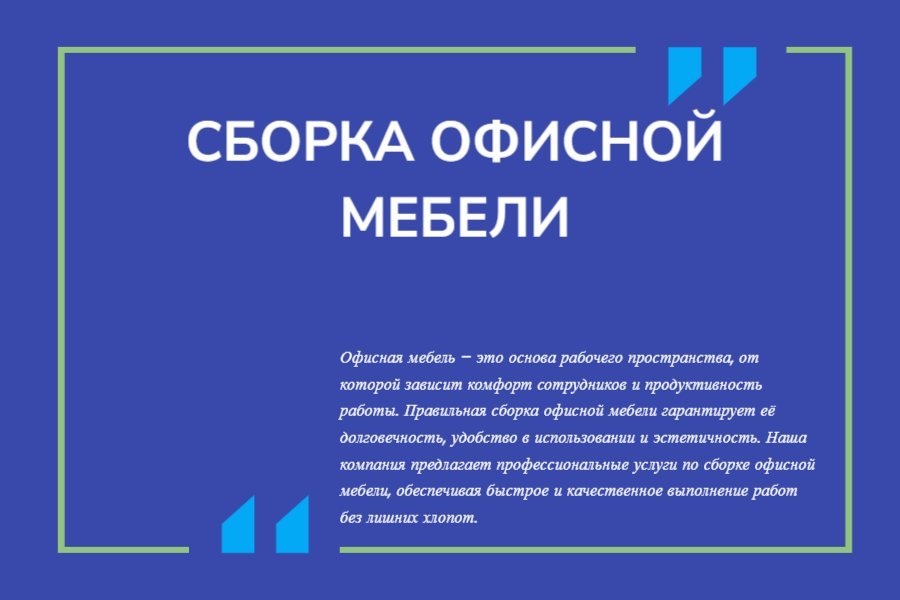 Офисная мебель – это основа рабочего пространства, от которой зависит комфорт сотрудников и продуктивность работы. Правильная сборка офисной мебели гарантирует её долговечность, удобство в использовании и эстетичность. Наша компания предлагает профессиональные услуги по сборке офисной мебели, обеспечивая быстрое и качественное выполнение работ без лишних хлопот.